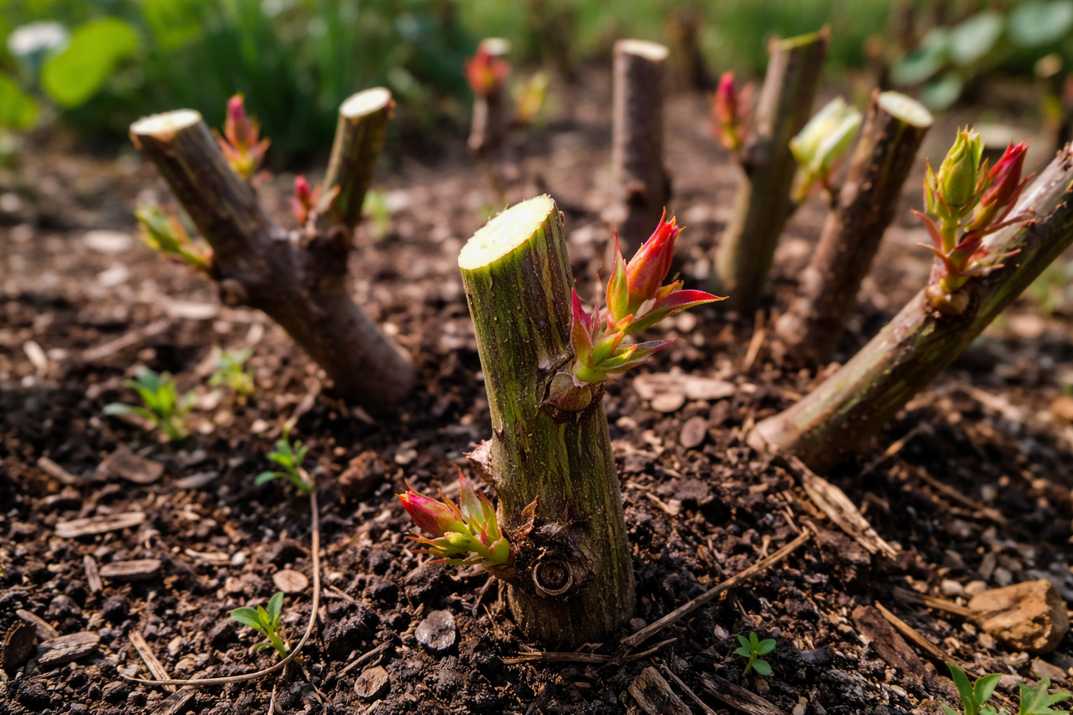 Postopek začnite takoj po odstranitvi zimskega zavetja, ko so popki šele začeli nabrekati, vendar se še niso razcveteli v liste.