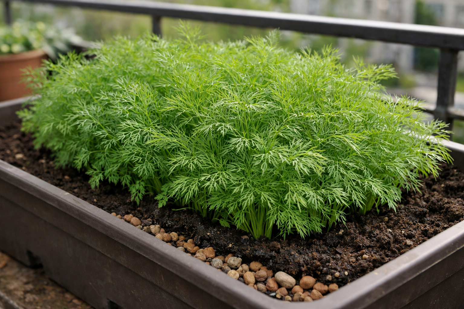 Za uspešen začetek balkonsko vrtnarjenje Izbira primerne posode je ključnega pomena. Koreninski sistem te začimbe zahteva dovolj prostora, zato majhne skodelice niso primerne. Praksa kaže, da so najboljši rezultati doseženi z dolgimi balkonskimi zaboji.