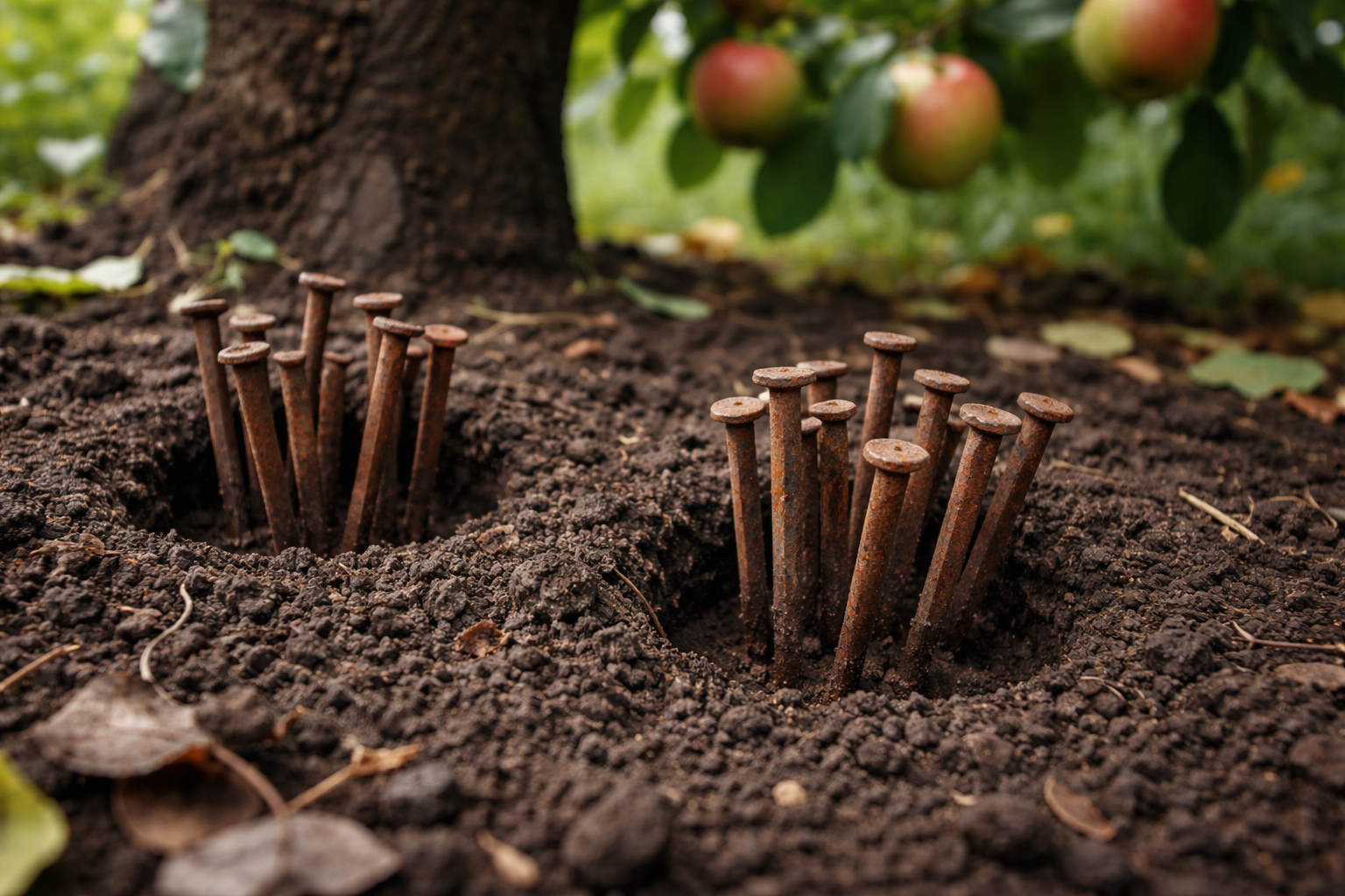 Jablane pogosto trpijo zaradi klorozaKloroza, zahrbtna bolezen, ki moti nastajanje klorofila v listih. Korenine drevesa ne morejo vedno absorbirati hranil iz tal, zlasti če so tla pregosta ali alkalna. Vkopavanje kovinskih predmetov sproži postopen proces oksidacije in stalno sproščanje razpoložljivih mikrohranil v območje korenin.