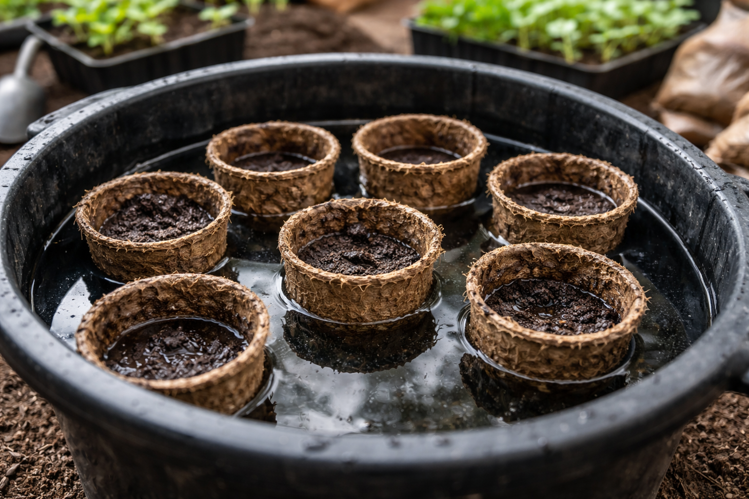 Vzdrževanje pravilne ravni vlage je polovica uspeha. Porozen struktura šote ima lastnost aktivnega izhlapevanja vode. Če tega procesa ne nadzorujemo, se gruda izsuši v nekaj urah, kar je kritično za mlade in šibke sadike.