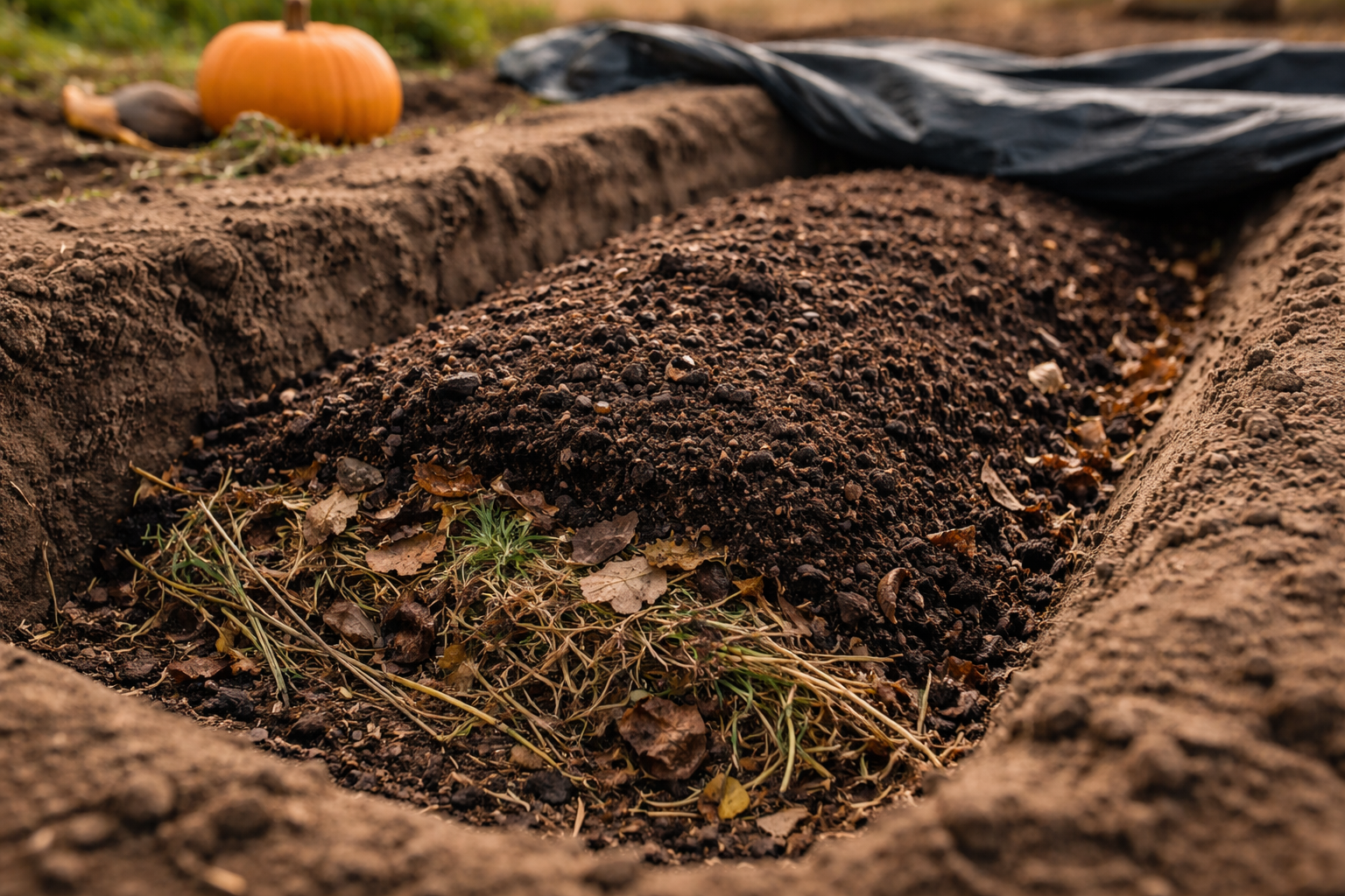 Odstranite vrhnji sloj zemlje in na dno jarka položite debelo plast organske snovi.
