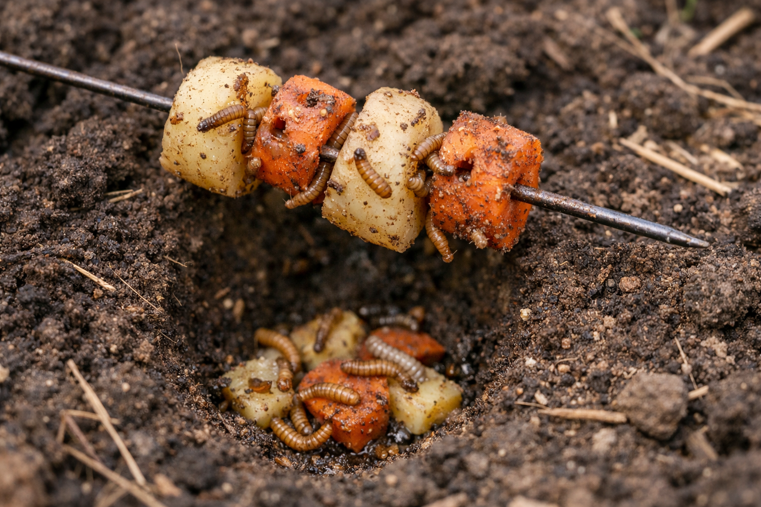 Za izdelavo učinkovite pasti je dovolj, da star krompir ali korenje narežemo na večje kose. Te je treba nanizati na žico in jih zakopati deset do petnajst centimetrov globoko na različnih delih zelenjavnega vrta.