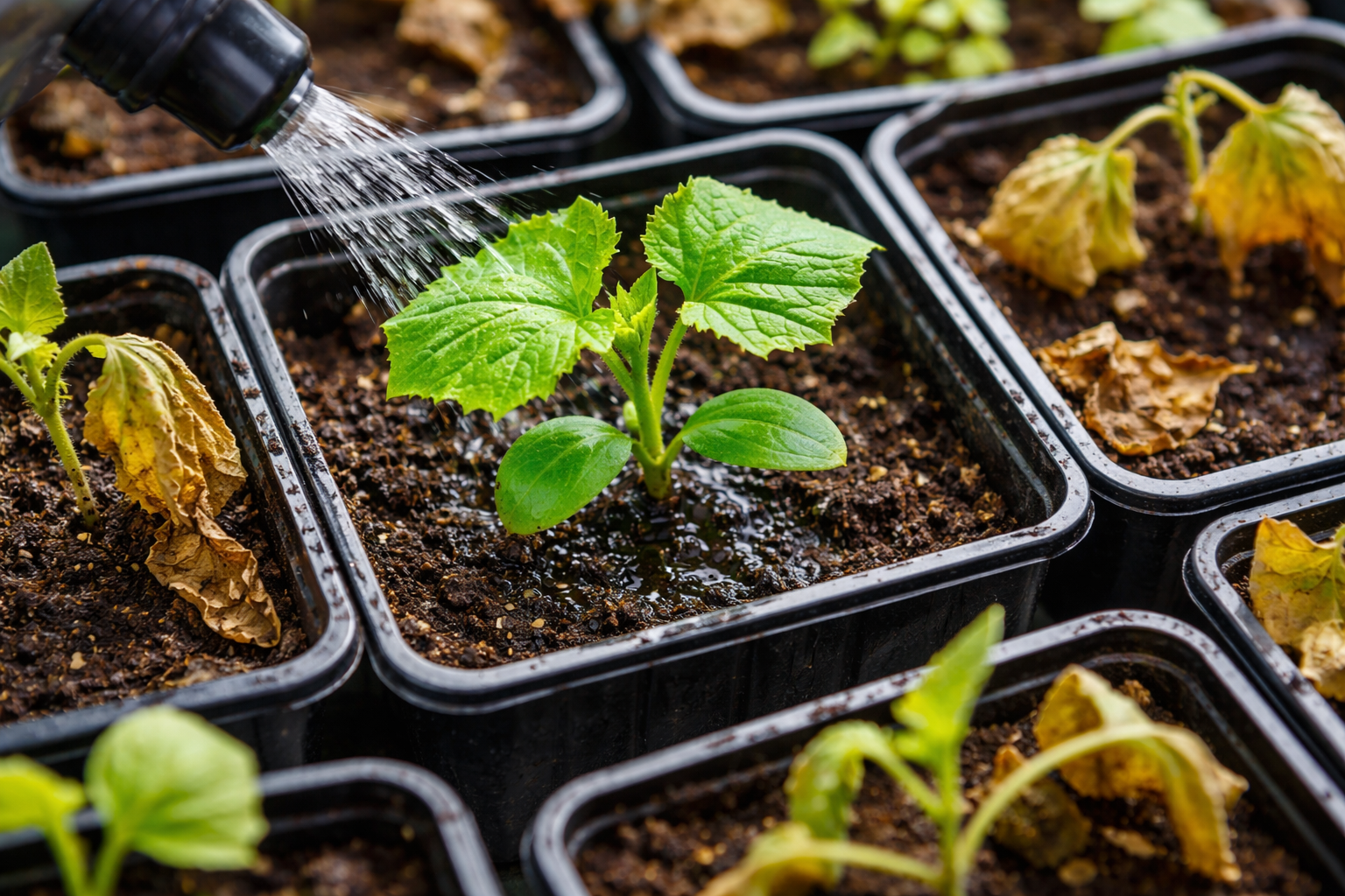 Pravilno zalivanje je umetnost, ki zahteva strogo ravnovesje. Temperaturni stres uniči sadike enako hitro kot suša. Voda mora biti vedno topla.