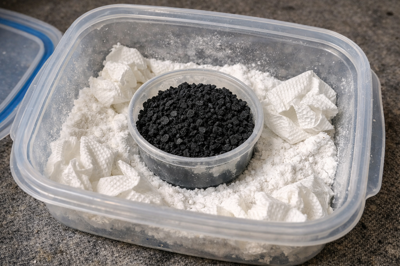 Zdrobljeno aktivno oglje pustite čez noč v zaprtih omarah, da absorbira hlapne kemične spojine.