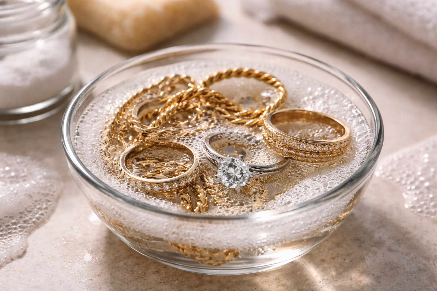 Glavna skrivnost popolnega čiščenja je v temperaturi vode, ki mora biti zmerno topla, da učinkovito raztopi kožno maščobo, vendar ne poškoduje lepila za nakit, ki pritrjuje kamne.