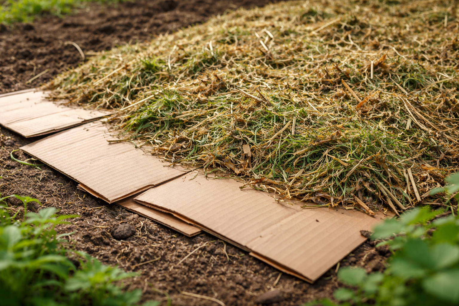Na območje plevela tesno položite liste navadnega valovitega kartona brez lepilnega traku.