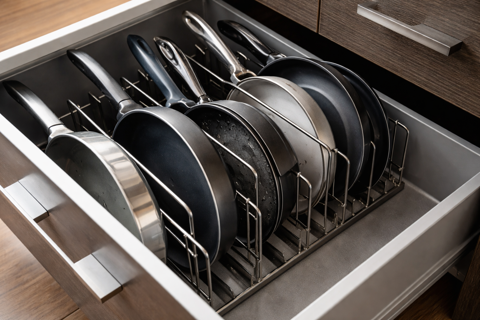 Za tiste, ki posodo raje shranjujejo v globoke predale, so idealni posebni predali. Razdelilniki. Z njimi lahko ponev postavite na robove kot knjigo na polico. S tem se ne le sprosti prostor, temveč lahko z enim gibom dosežete želeni predmet, ne da bi vam bilo treba prestavljati druge.