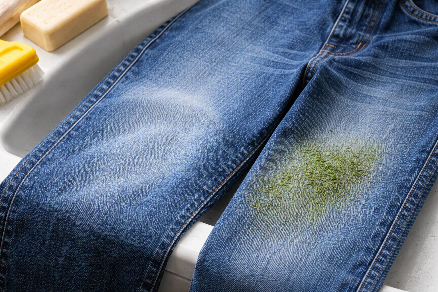 Pomembno pojasnilo: nikoli ne drgnite svežega madeža trave s suho krpo, saj boste s tem jedko barvilo le pognali globlje v strukturo niti džinsa.